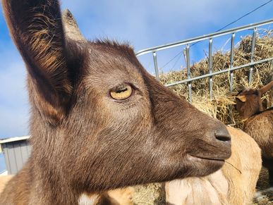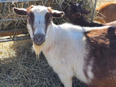 We were super excited to add Maddie to the ranch in 2024! She is a BIG girl, towering over the others! She typically kids 4-5 babies each year so she keeps us on our toes!