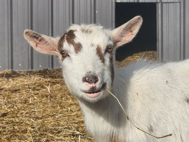 Nini, our bonus big girl! Nini is a Saanen and is not registered. In 2021 when I made friends with another goat lady, I met Nini. I told my friend, if you ever want to get rid of her I WANT her. Well in 2025, that friend decided to downsize and Nini joined the crew at Half Eaton Ranch. We love having her here! She keeps everyone in line.