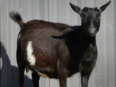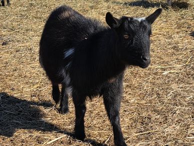 One of our 2025 retained kids, she is a wild one! Georgia is a strong independent goat who loves flaunting her moonspots!
